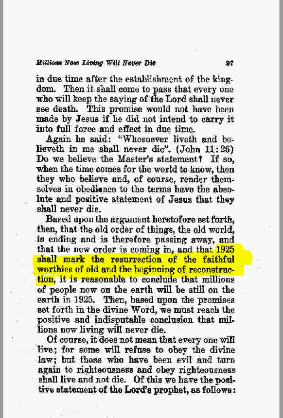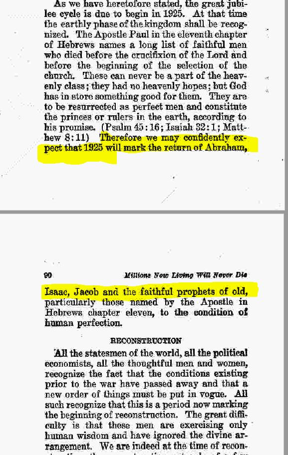 We may confidently expect that 1925 will mark the return of Abraham, Isaac, Jacob and the faithful prophets of old … 1925 shall mark the resurrection of the faithful worthies of old and the beginning of the reconstruction…