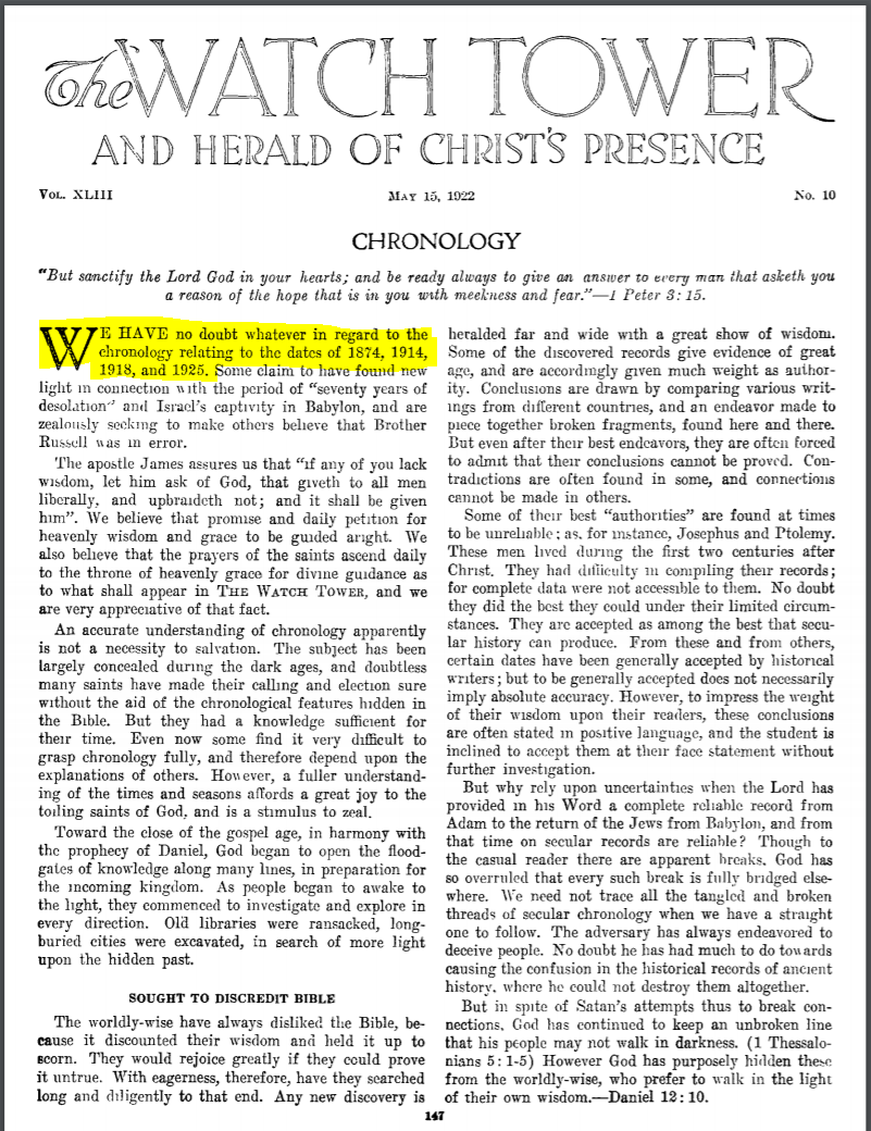 — Millions Now Living May Never Die, pp. 89, 90, 97We have no doubt whatever in regard to the chronology relating to the dates of 1874, 1914, 1918, and 1925.