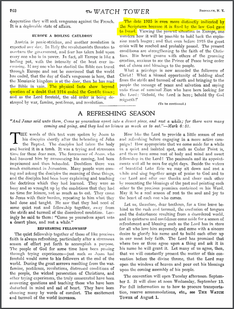So what about the Watchtower? They’re less inclined to put their sensational predictions on the covers, so we have to look for the quotes contained in their publications. For instance, in the early 1920’s, the Watchtower published the following statements: