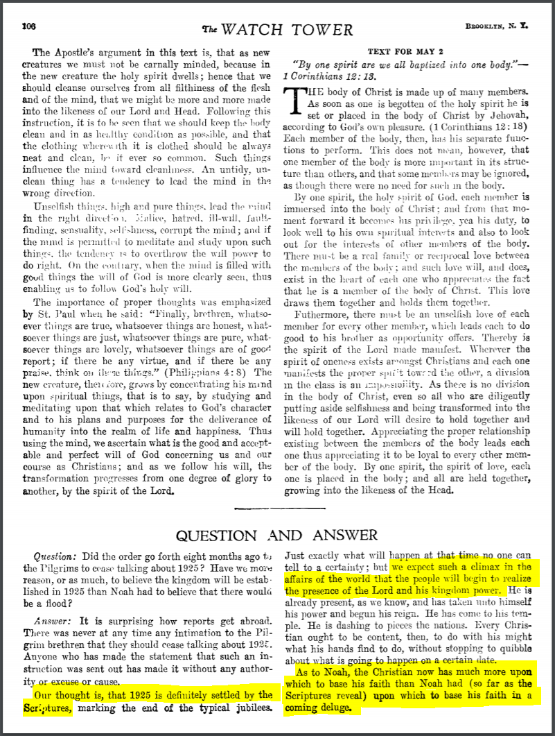 — The Watchtower 9/1/22, page 262Our thought is, that 1925 is definitely settled by the Scriptures. As to Noah, the Christian now has much more upon which to base his faith than Noah had upon which to base his faith in a coming deluge.