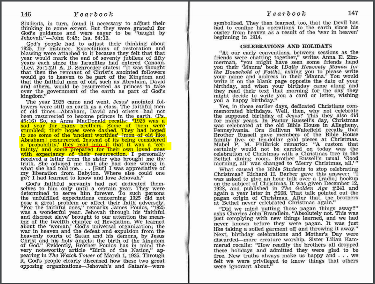I selected the above prophecy because it is so crystal clear. We have none of the hemming and hawing and feeble qualifications that we heard regarding 1975. No; the 1925 prophecy was as clear as could be: it was a certainty for which the Christian had proof: more proof than for the Noachian flood or for the pivotal year 1914! More certain than death and taxes (since they were among the “millions who would never die”, and had quickly gone back to calling themselves a “religion” so they wouldn’t have to pay taxes) there was nothing more certain in the organization than that they’d be rubbing shoulders with Abraham and Isaac et al. out in the door-to-door ministry come 1925. Imagine the privilege for the proud brother assigned to show King David how to work the gramophone to play Rutherford’s speeches at the householders’ doors!