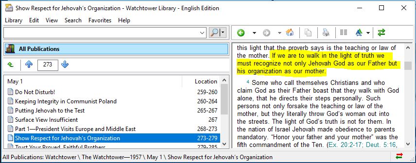 –Watchtower, 2/1/1940 p.47In submitting to Jehovah’s visible theocratic organization, we must be in full and complete agreement with every feature of its apostolic procedure and requirements.