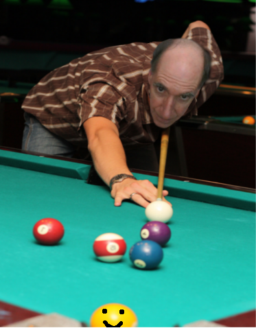 After work you head over to Happy's Bar & Billiards for happy hour which starts at 6 o'clock. You go there mostly to watch the pool players. Tonight an amateur is playing in the front room with one of Happy's notoriously curved pool cues. The guy is aiming at the yellow ball (which is emblazoned with a happy face