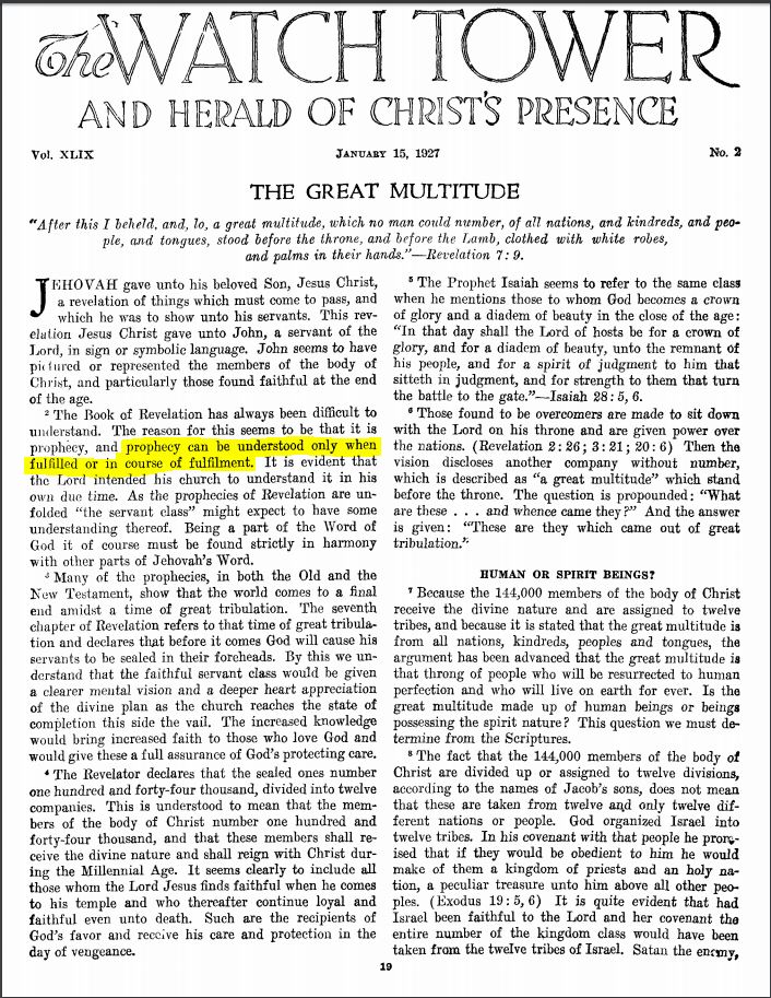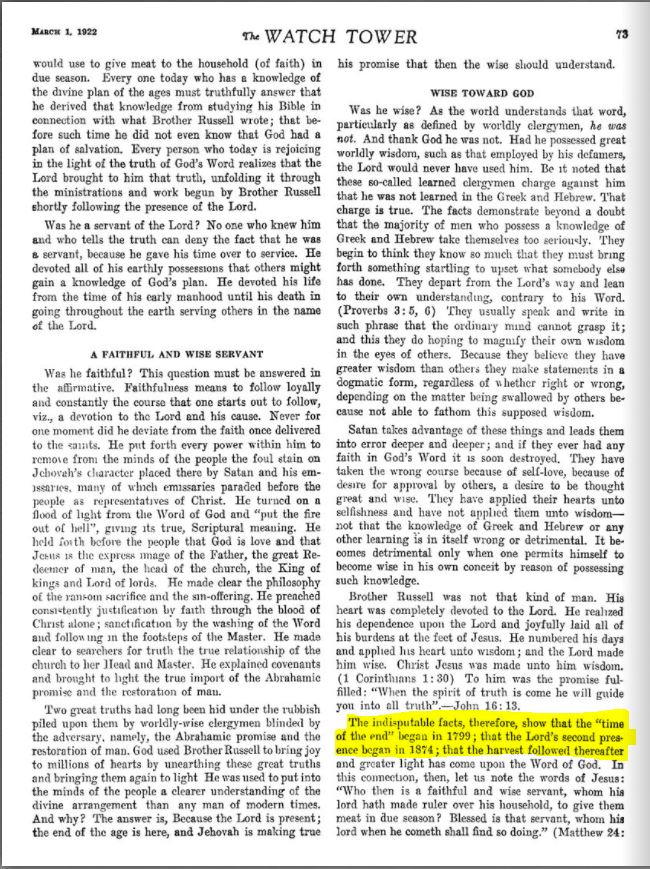 While pretending that Russell had “the truth” about 1914 being the start of the “time of the end,” the Watchtower explains that the reason why no one before Russell’s time recognized the truth about the date is because it had been “sealed up until the time of the end.” This made some sense when the start of the “last days” was believed to be 1799: well before Russell’s birth. But today it makes no sense for them to make this claim: how could Russell have understood the significance of 1914 (the “start of the time of the end”) prior to that year if the knowledge was “sealed up” until that date? (See, for instance: The Harp of God p. 231, published by Watchtower president Rutherford in 1921.)