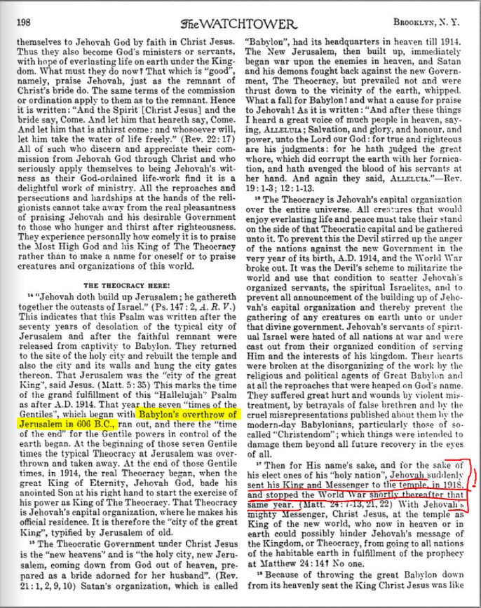 They actually taught that it was 606 BCE for nearly half of their history — that’s how long it took them to realize that the math didn’t work out due to there having been no zero year between BCE and CE — so then they simply moved the historical date back a year: what power they have to rewrite history to fit their interpretations! This reveals how they just move dates and manipulate facts to comport with their doctrines instead of honestly going by the evidence. (See, for instance the July 1, 1942 Watchtower page 198, which refers to: “Babylon’s overthrow of Jerusalem in 606 B.C.”)