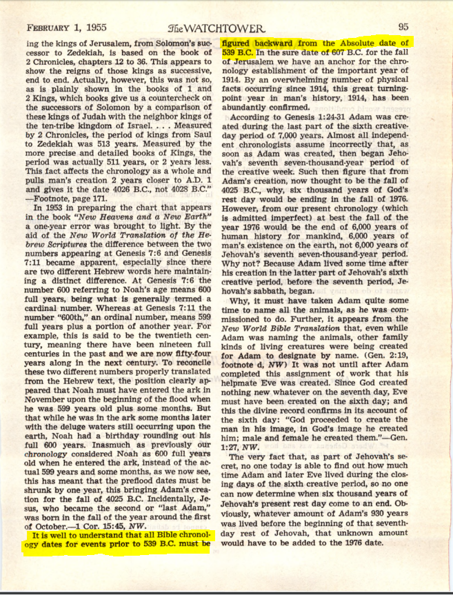 The Watchtower is on record as saying that “all events prior to 539 BCE must be figured backwards from the absolute date of 539 BCE.” (2/1/1955 WT p. 95)