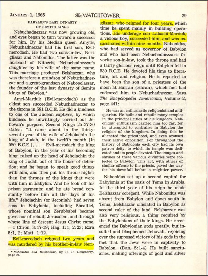 Right away you can see a problem here: Nebuchadnezzar’s reign didn’t start until 605 BCE: 2 years after the WT claims that he destroyed Jerusalem as king of Babylon! But it’s worse than that. The Watchtower (and the Bible book of 2Kings) tells us that Nebuchadnezzar didn’t destroy Jerusalem in his first year in office. No; he did the deed in the 18th year of his reign: