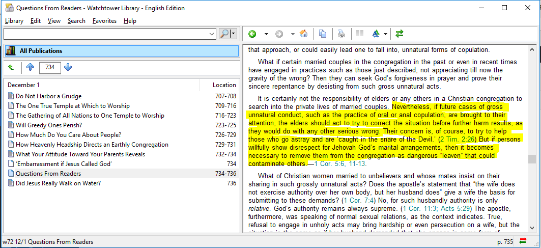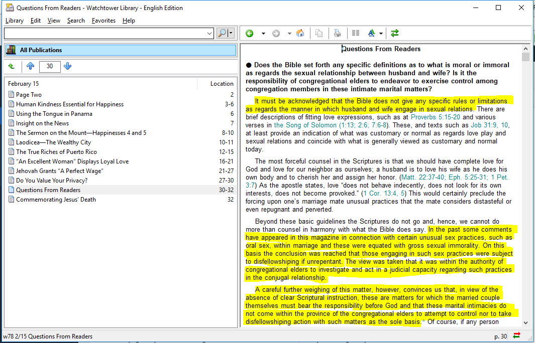 For instance, oral and anal sex between married couples was later declared not to be against the Bible’s moral code, and hence no longer a disfellowshipping offense: