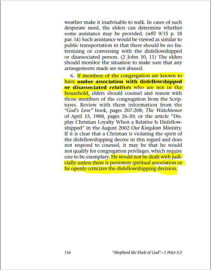 This is in spite of the fact that the secret handbook that only elders are allowed to see, Shepherding the Flock of God, now states that a Witness who has “undue association” with a disfellowshipped relative should be “counseled” and “lose privileges” but should not be hauled before a judicial committee to be disfellowshipped [as long as it’s not a “spritual” association and the disfellowshipping decision isn’t criticized.]