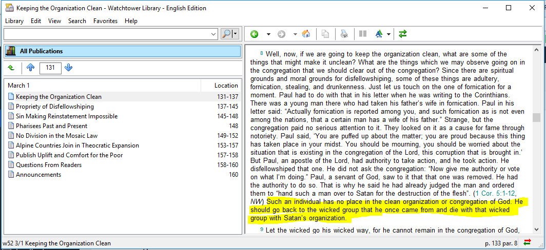 Well, the reason for disfellowshipping is that some persons get into this congregation of God that do not love Christ… Such an individual has no place in the clean organization or congregation of God. He should go back to the wicked group that he once came from and die with that wicked group with Satan’s organization.