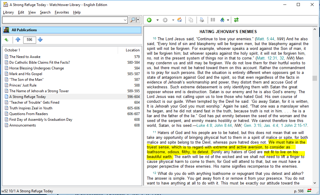 -– The Watchtower, July 15, 1992, pages 12, 13We must hate in the truest sense, which is to regard with extreme and active aversion, to consider as loathsome, odious, filthy, to detest.”