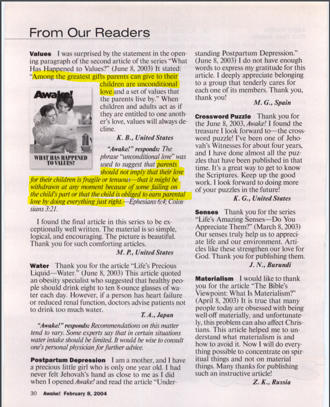This is especially ironic since the Watchtower claims that the basis of disfellowshipping is love! (Watchtower 1952 Mar 1 p. 131) It’s even more ironic when a son or daughter is involved in “apostasy” (i.e. thinking for themselves); parents who’ve been instructed to give “unconditional love” must now “hate, loathe, and detest” them!