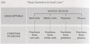 “Is it wrong to sustain life by administering a transfusion of blood or plasma or red cells or others of the component parts of the blood? Yes!…The prohibition includes “any blood at all.” (Leviticus 3:17)