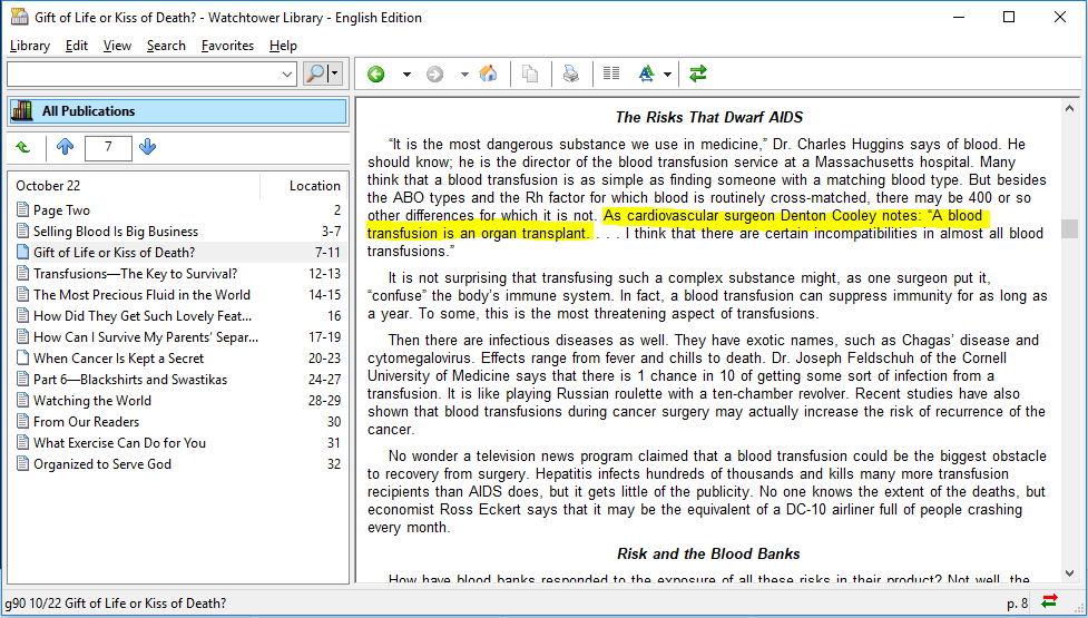 (The Watchtower, March 15, 1980, p. 31)As cardiovascular surgeon Denton Cooley notes: ‘A blood transfusion is an organ transplant.’