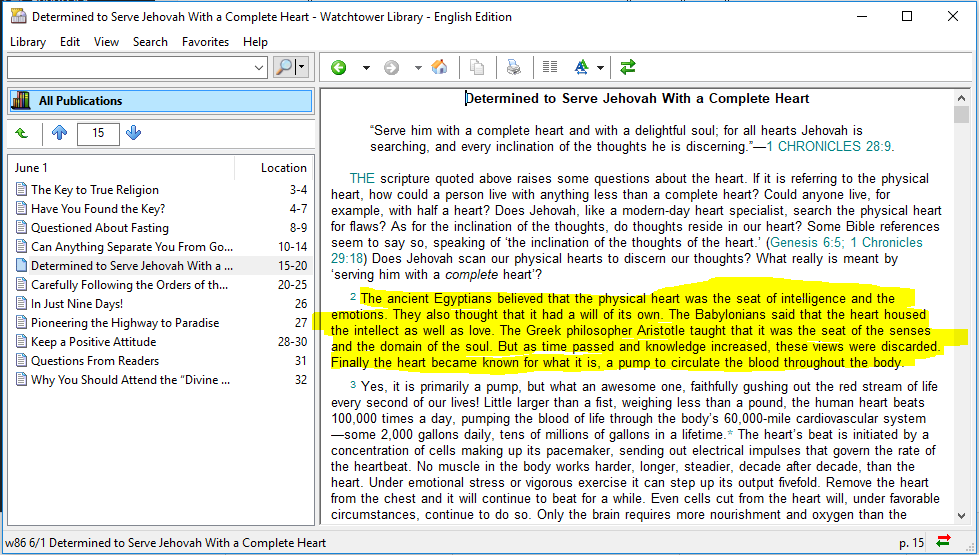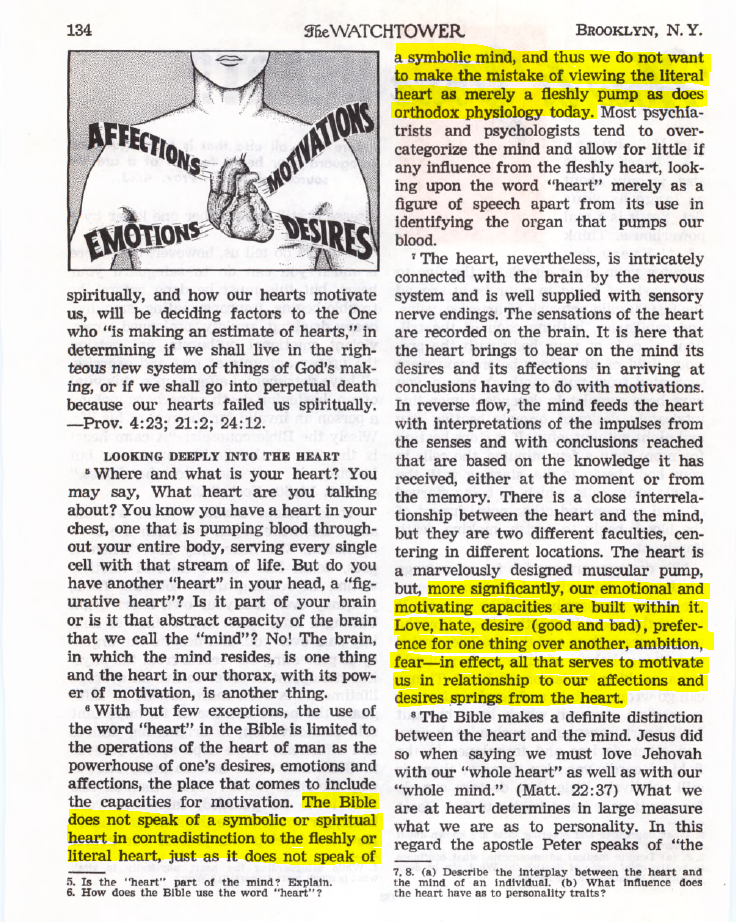 —Watchtower 1961 Sep 15 p.564The Bible does not speak of a symbolic or spiritual heart in contradistinction to the fleshly or literal heart, just as it does not speak of a symbolic mind, and thus we do not want to make the mistake of viewing the literal heart as merely a fleshly pump as does orthodox physiology today… more significantly, our emotional and motivating capacities are built within it. Love, hate, desire (good and bad), preference for one thing over another, ambition, fear—in effect, all that serves to motivate us in relationship to our affections and desires springs from the heart.”