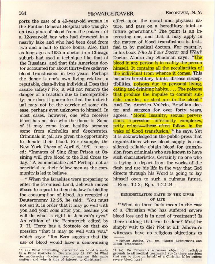 I sure hope they don’t inherit any of our “moral insanity and sexual perversions” or “the impulse to commit suicide, murder, or steal” from the blood we donate to them! Maybe the intrepid medical experts at Watchtower headquarters have developed a way to cut these objectionable things out during their fractionation of our blood. {sarcasm}