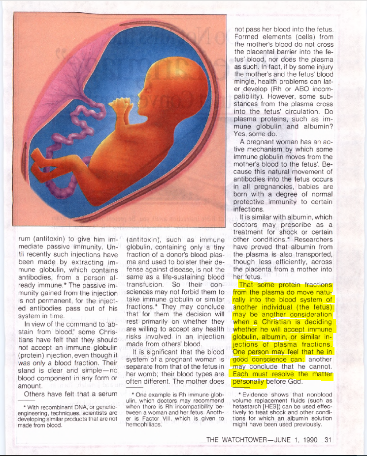 The above is basing the acceptability of blood fractions on the fact that such fractions are naturally transferred between a mother and fetus. However, some red blood cells (and possibly other components) can also pass through the placental barrier (at least at birth), so on this reasoning the Watchtower should permit transfusion of the “major components” of blood as well. But they don’t; their rules lack all consistency and sense.