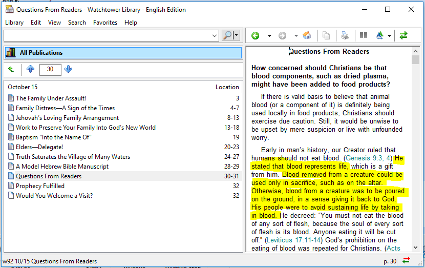 So, settle in and get comfy; there’s a lot to go over. We’re going to peel this onion, and hopefully not make you cry too much. We’re going to start with the basic broad assumptions, and work our way down to the nitty-gritty. In order to remain a believer in the Watchtower’s claim that blood transfusions are sinful you will need to accept all of the assumptions we examine in each and every step along the way. This is an important point; you may indeed accept some of the assumptions in one or more steps — but that’s not good enough; you have to accept them all, or else you’ll need to toss the Watchtower doctrine out the window and head off to your nearest Red Cross and donate some blood.