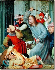 Jn:2:13: And the Jews' passover was at hand, and Jesus went up to Jerusalem, Jn:2:14: And found in the temple those that sold oxen and sheep and doves, and the changers of money sitting: Jn:2:15: And when he had made a scourge of small cords, he drove them all out of the temple, and the sheep, and the oxen; and poured out the changers' money, and overthrew the tables;