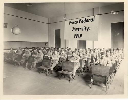 The TV behind the bar is broken, so at 8 o'clock each night the bartender unfurls a faded movie-projector screen and shows an old movie. Tonight's feature is a B&W prison flick which takes place at the Frisco Federal Penitentiary. The first scene opens on the warden's pride and joy: his make-shift classroom he fondly refers to as the frisco federal university (being non-accredited, it doesn't rate capitalization.) The prisoners march in: the complete dunces to the left, and incomplete dunces to the right. The warden commands: "Both sides down!" And the men take their seats.