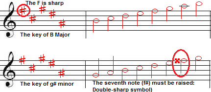 When a 7th note would be sharp according to the key-signature, we must "double-sharp" it in the Harmonic minor scale with a special double-sharp symbol. Compare B Major with its related minor key: g# minor.