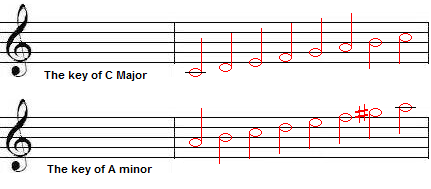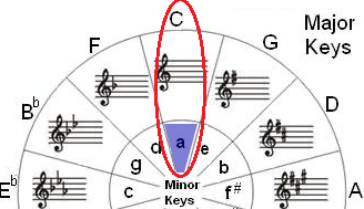 The minor key related to C Major is A minor. So, A minor has a blank key signature (i.e. no sharps or flats). It has the same 7 notes as the key of C, but it starts with the A note instead of the C note. Because of this -- because it starts on the 6th note of the Major pattern (3 half-steps from the top note: hence the name "minor third"), it skews that pattern as follows:
