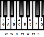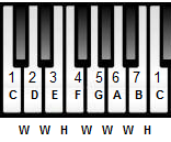 If you look at the piano keyboard you see that the white and black notes are not evenly spaced: some white keys have no black note between them. If you look at the keyboard starting with C, it is very easy to see the C Major scale: it follows the Major pattern given above by only using the white keys: