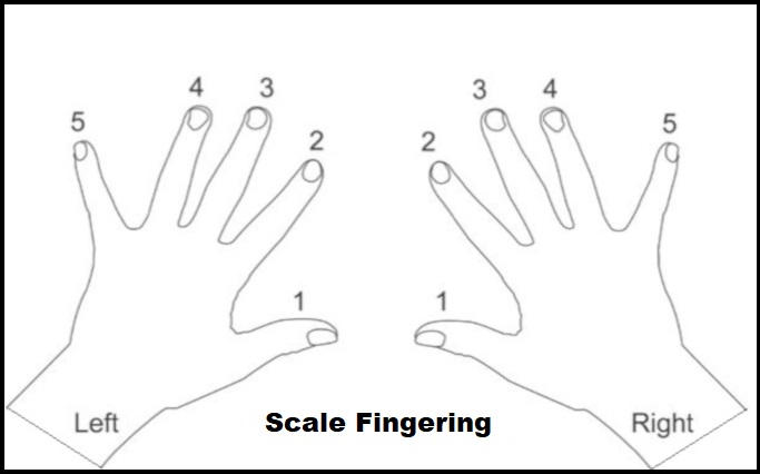 When playing a scale on the piano, it is important to use the correct fingers to play each note. On this page, the recommended fingerings are shown on the piano keyboard (with black numbers for the bass [left hand], and red numbers for the treble [right hand].) 1=thumb, 2=forefinger... 5=pinky.