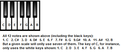 There are 12 different notes, but only 7 are used in each scale. (There are other types of scales such as the Pentatonic which uses 5 notes per scale, but we're not going to discuss these.) Each scale begins with one of the 12 notes, and ascends through a series of notes until it arrives at the starting note one octave (8 scale-notes) higher.