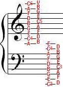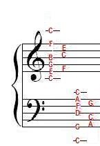 Finally, it's a good idea to remember where all of the C notes are. Notice that between the Treble and Bass staffs they are a mirror image of each other! You now have tips for remembering all of the notes shown below. Filling in the gaps shouldn't be too hard, and before you know it you'll be recognizing the notes by sight, especially if you practice on this page frequently.