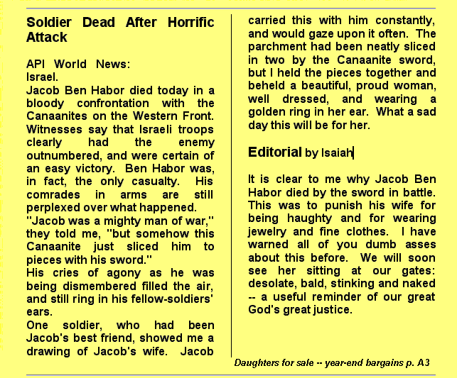 Chapter 23: Isaiah Isa:1:3: The ox knoweth his owner, and the ass his master's crib: but Israel doth not know, my people doth not consider. I very much doubt that oxen or asses understand the concept of ownership. Nor do they slave away for their "masters" willingly (as the context implies). Given a chance, an ox and an ass would rebel and flee from their forced labor even more readily than Israel evidently rebelled against the yoke of their excessive religious laws. So, "the Lord's" analogy in the verse above wouldn't pass in an elementary-school essay. Also, I don't know about you, but if I picked up a book in which the author began by implying that his readers were asses (or didn't have as much sense as an ass) I would stop reading. But evidently the Israelites were addicted to such verbal abuse. Isa:1:11: To what purpose is the multitude of your sacrifices unto me? saith the LORD: I am full of the burnt offerings of rams, and the fat of fed beasts; and I delight not in the blood of bullocks, or of lambs, or of he goats. Isa:1:12: When ye come to appear before me, who hath required this at your hand, to tread my courts? Evidently, "the Lord" did not believe the books of the Bible up to this point. The first five books (the so-called "books of Moses" or "Torah") clearly answered the Lord's question: God himself had required these animal sacrifices, and this "appearing before him". They were written in stone as part of the "ten commandments" (see my chapter on Exodus). This was supposed to be a "statute forever". But, forever didn't last very long according to Isaiah. In time, God got bored with the sacrifices. Isa:1:13: Bring no more vain oblations; incense is an abomination unto me; the new moons and sabbaths, the calling of assemblies, I cannot away with; it is iniquity, even the solemn meeting. Isa:1:14: Your new moons and your appointed feasts my soul hateth: they are a trouble unto me; I am weary to bear them. Seventh Day Adventists insist that the Sabbath law never passed away with the other Mosaic laws (since it preceded the Mosaic laws). But here in the book of Isaiah we are told a different story. God no longer wanted people to observe the Sabbath or the sacred feasts he had previously commanded to be observed forever. He now "hated" such things! He was "weary" of them (if we can imagine an omnipotent being becoming weary.) He hereby ordered such observances to stop! Isa:1:15: And when ye spread forth your hands, I will hide mine eyes from you: yea, when ye make many prayers, I will not hear: your hands are full of blood. Isa:1:16: Wash you, make you clean; put away the evil of your doings from before mine eyes; cease to do evil; Isa:1:17: Learn to do well; seek judgment, relieve the oppressed, judge the fatherless, plead for the widow. There you have it. God was singing a totally new tune: he would not listen to the Israelite's prayers because their hands were full of blood. This was blood from animal sacrifices as well as from the bloodshed of war (wars which the Bible had previously claimed were ordered by this same god). So, according to the Bible, large parts of the Mosaic law had actually passed away and been replaced with the "law of love" centuries before Jesus. Isa:2:4: And he shall judge among the nations, and shall rebuke many people: and they shall beat their swords into plowshares, and their spears into pruninghooks: nation shall not lift up sword against nation, neither shall they learn war any more. Here, Isaiah prophesied a time when Israel would rule the world, and this war-mongering nation would somehow bring about world peace! Isaiah looked forward to a time when people would not "learn war any more". This is certainly a worthwhile goal, but it contradicts another part of the Bible in which "learning war" for its own sake was advocated (Judges 3:1-2). Nor can we claim that the Israelites were here meant to represent Jesus (someone Isaiah didn't know). Because the Bible tells us that Jesus was far from advocating disarmament: Mt:10:34: Think not that I am come to send peace on earth: I came not to send peace, but a sword. Isa:3:12: As for my people, children are their oppressors, and women rule over them. O my people, they which lead thee cause thee to err, and destroy the way of thy paths. The above is listed here amongst the "calamities" which Isaiah claimed had befallen the Israelites. The assumption he made is that it would be an outrageously evil thing to have a woman in a leadership role. Maybe Isaiah had forgotten about the Biblical book of Judges which recounts the story of Deborah: a woman who was a judge over Israel (Judges 4:4). Isa:3:16: Moreover the LORD saith, Because the daughters of Zion are haughty, and walk with stretched forth necks and wanton eyes, walking and mincing as they go, and making a tinkling with their feet: Isa:3:17: Therefore the LORD will smite with a scab the crown of the head of the daughters of Zion, and the LORD will discover their secret parts. Isa:3:18: In that day the Lord will take away the bravery of their tinkling ornaments about their feet, and their cauls, and their round tires like the moon, Isa:3:19: The chains, and the bracelets, and the mufflers, Isa:3:20: The bonnets, and the ornaments of the legs, and the headbands, and the tablets, and the earrings, Isa:3:21: The rings, and nose jewels, Isa:3:22: The changeable suits of apparel, and the mantles, and the wimples, and the crisping pins, Isa:3:23: The glasses, and the fine linen, and the hoods, and the vails. Isa:3:24: And it shall come to pass, that instead of sweet smell there shall be stink; and instead of a girdle a rent; and instead of well set hair baldness; and instead of a stomacher a girding of sackcloth; and burning instead of beauty. Isa:3:25: Thy men shall fall by the sword, and thy mighty in the war. Isa:3:26: And her gates shall lament and mourn; and she being desolate shall sit upon the ground. From the above, it sounds as if Isaiah was a misogyn